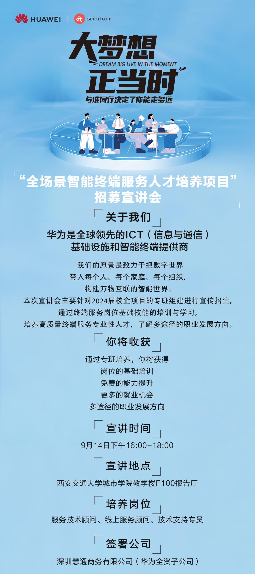本次宣讲会由华为智能终端服务专家带来最新的行业技术分享,企业项目专班培训,帮助学生提升技术知识,诚邀全院师生参加!
