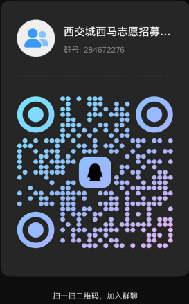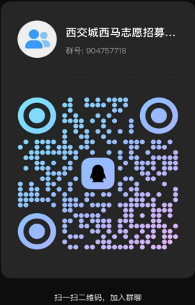 请通过初选符合条件的志愿者扫码加入西交城西马志愿招募工作群1(QQ:904757718)或西交城西马志愿招募工作群2(QQ:284672276),随时关注群内发布的志愿服务相关通知。