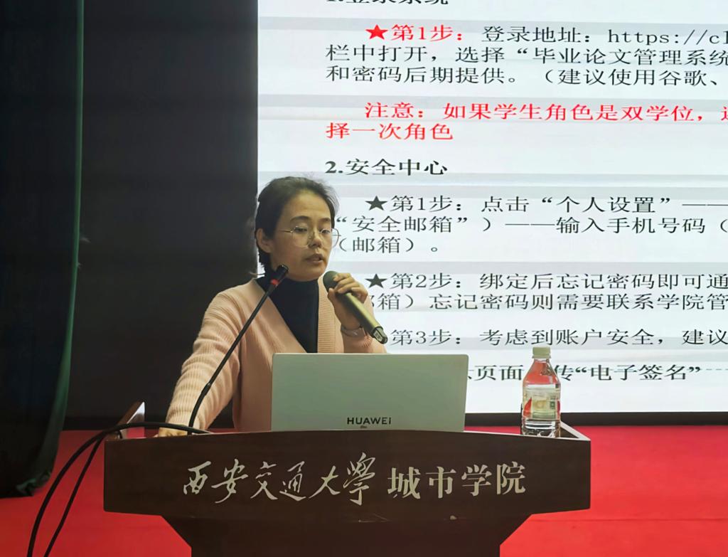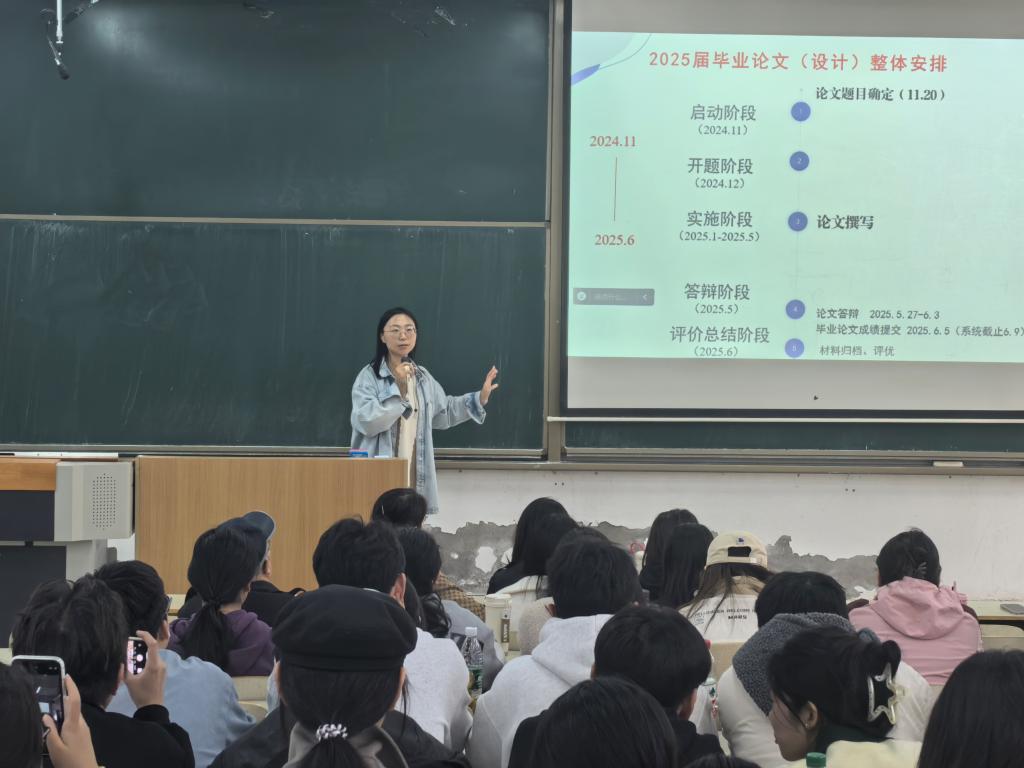 会上,毕业论文专项负责老师石晓霞对传媒学院2025届本科毕业论文(设计)工作整体安排进行了详细说明,对毕业论文启动阶段、开题阶段、实施阶段、答辩阶段以及总结评价阶段各环节关键时间节点及注意事项进行了强调。她表示,全体同学要认识到毕业论文原创性与学术规范的重要性,端正态度,积极与指导老师配合,按照学校论文工作安排有序推进,顺利完成毕业论文写作与答辩,圆满完成本科学业。