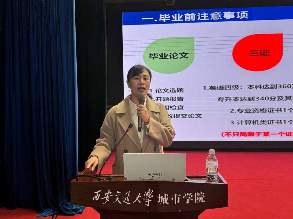 刘健详细阐述了毕业要求,包括学分、证书、论文质量标准以及实践活动参与度等具体指标。同时,她深入分析了当前的就业市场形势,指出就业竞争日益激烈,对人才的要求也在不断提高,她鼓励同学们要不断增强自身的专业技能和综合素质,提升在就业市场上的竞争力。