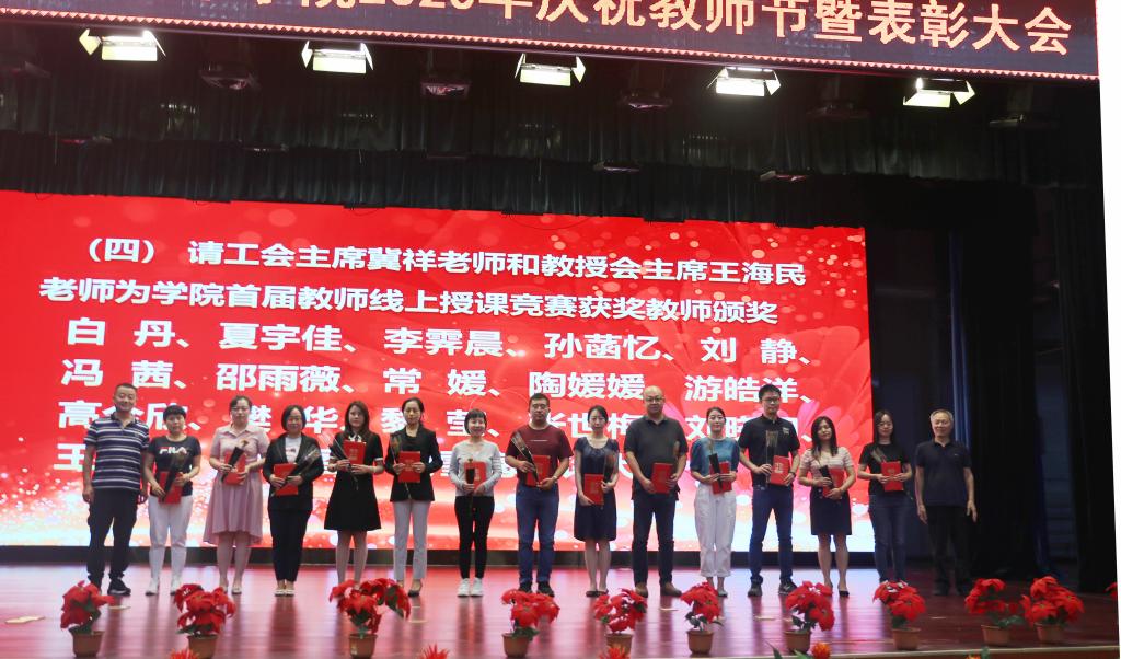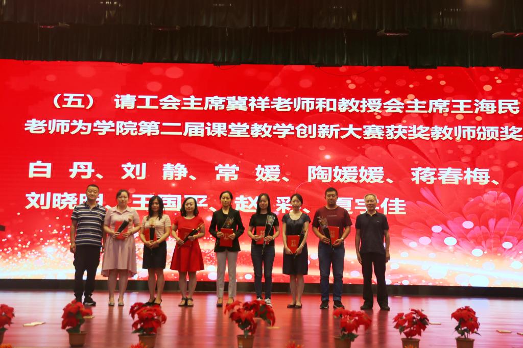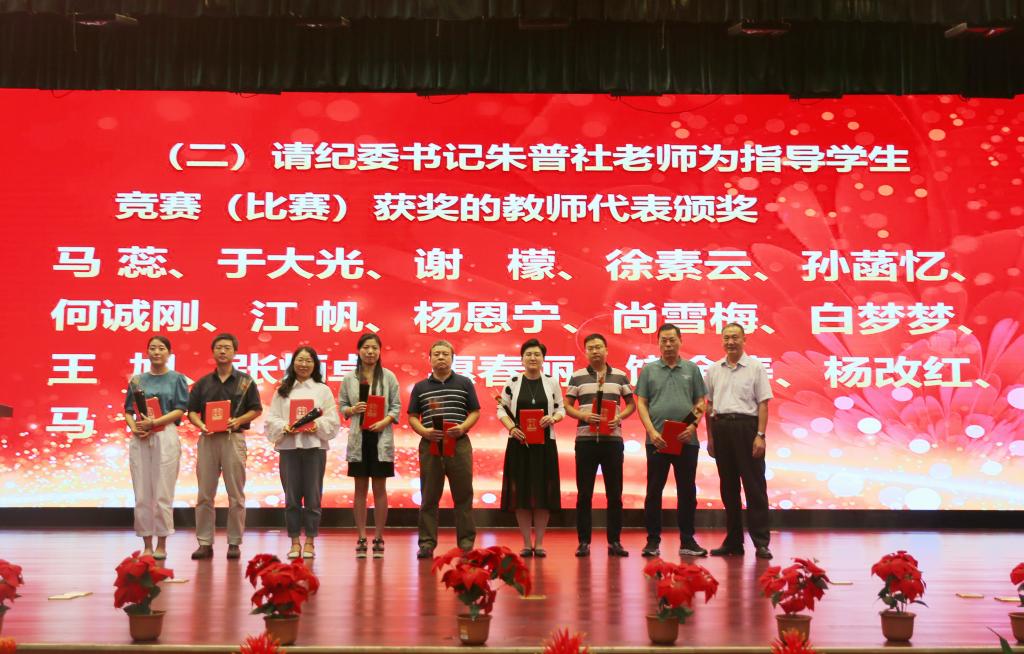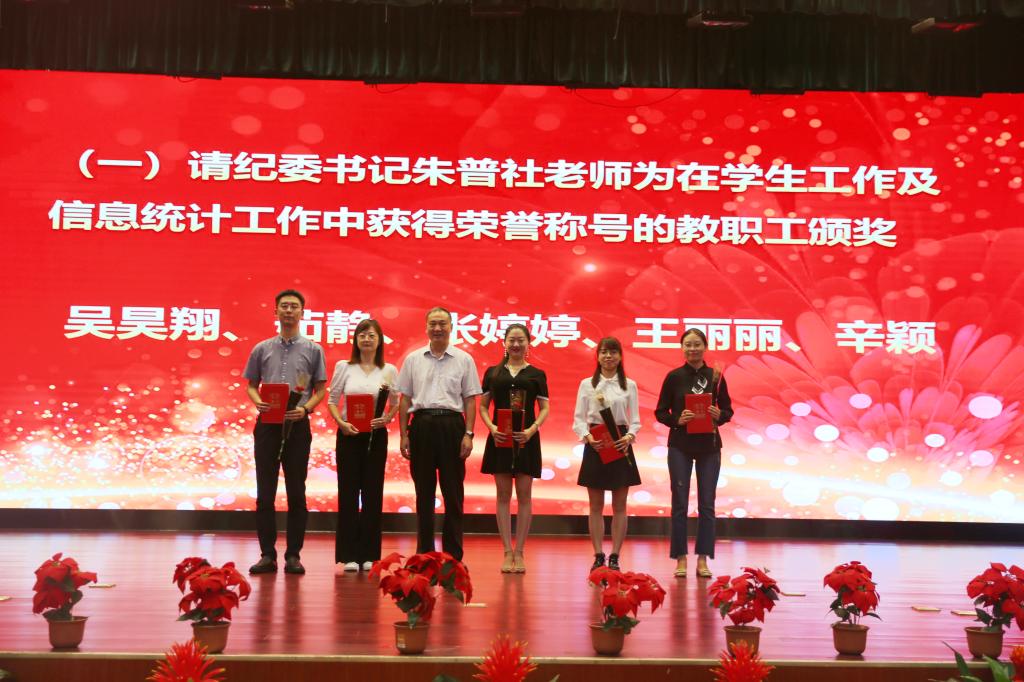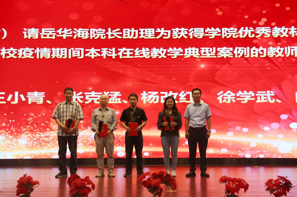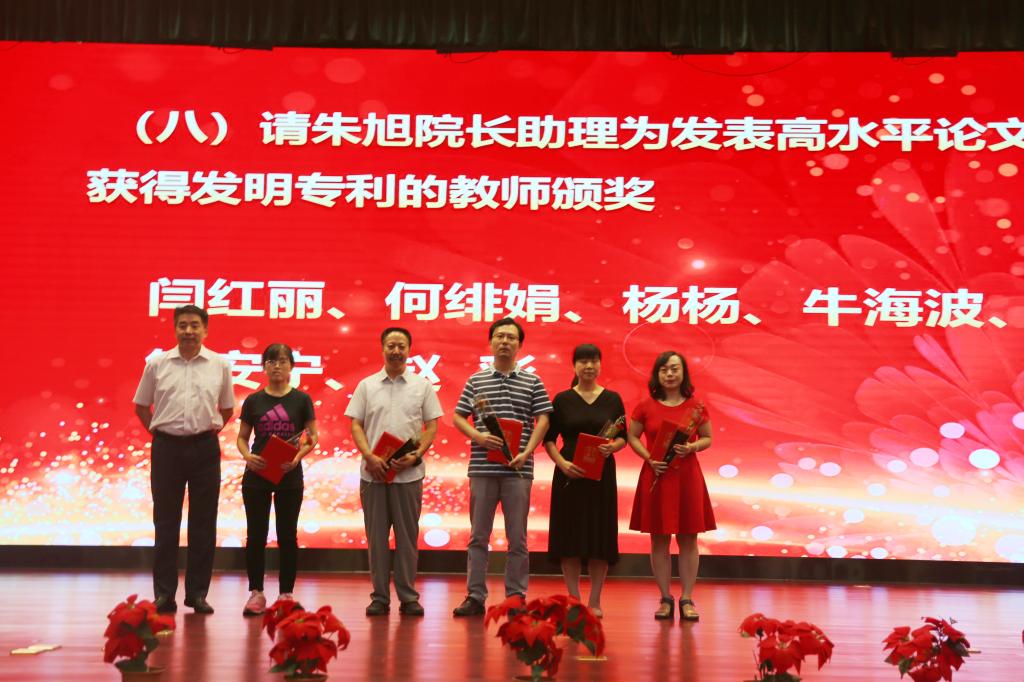 奏国歌仪式后,院长助理朱旭宣布受表彰人员名单,对一年来在教学、科研、指导学生竞赛方面取得成绩的先进个人和集体进行表彰,一大批教职员工获得国家级、省部级和校级各类荣誉称号与奖励。与会院领导分别为获奖个人和集体颁发荣誉证书,并赠送鲜花。