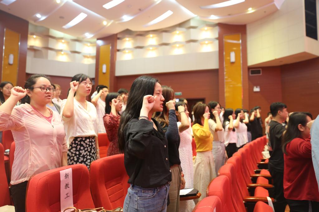 教师代表白丹在发言中指出,她始终以“教好每一个学生,备好每一堂课”为自己的根本准则与目标,将“立德树人”融入教书育人全过程,通过多种形式落实课程思政,引导学生树立 “家国情怀”。 在科研工作上,始终践行“顶天、立地、育人”的科研工作理念,从选题开始就秉承科研成果服务社会、反哺教学。她通过任教八年来的成长经历,表达了对437ccm·必赢国际的感恩与感激之情。学生代表计算机系赵旭升同学在发言中对各位老师致以节日的问候,感恩老师的教诲之恩。随后,由教授会主席王海民教授领誓,全体新入职教师起立并右手握拳宣誓,做出庄严的师德承诺。