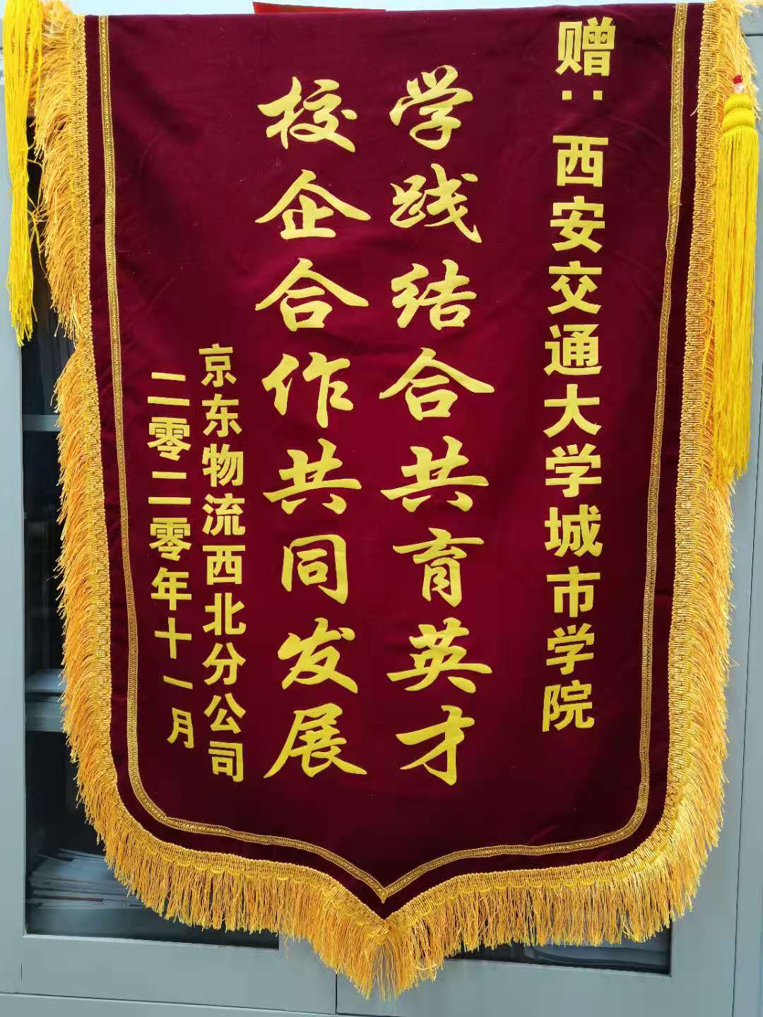 近日,京东物流西北分公司(简称京东西北区)人力资源经理白光泽先生莅临管理系,为管理系送上“学践结合共育英才,校企合作共同发展”锦旗一面,以表彰管理系物流管理专业实习生在本次京东西北区双十一大促集中实习中的优良表现。