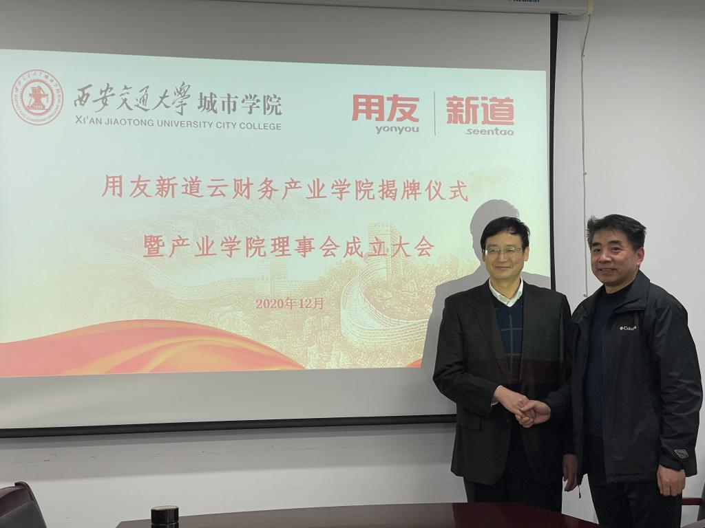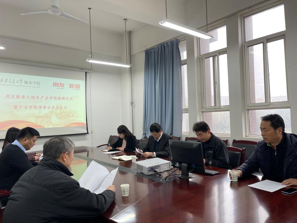 12月2日中午,我院管理系与用友新道科技股份有限公司举行云财务产业学院揭牌仪式暨产业学院理事会成立大会。学院副院长朱旭、教学服务中心主任陈晓南、管理系主任张俊瑞、管理系常务副主任郭关科、管理系副主任解茹玉、新道科技股份有限公司西北大区总经理张桐、副总经理吴海鱼出席了本次大会。会议由管理系常务副主任郭关科主持。