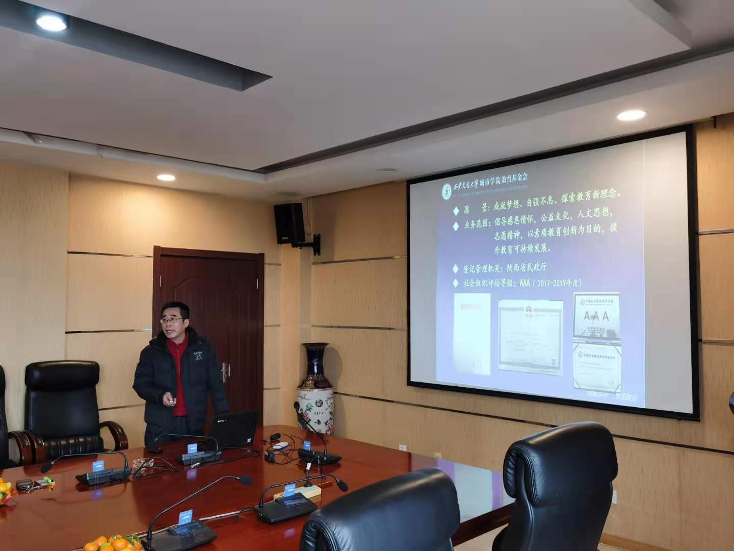 根据《陕西省民政厅关于开展2020年度社会组织评估工作的通知》要求,我院教育基金会于2020年9月23日完成等级评估申请和材料上报工作。2020年12月11日上午,评估专家一行6人莅临我院,对基金会规范化建设和整体运行情况进行实地考察和现场评估。学院党委书记、基金会理事长张爱萍,学院副院长、基金会秘书长岳华海以及基金会工作人员参加评估会。评估会由评估专家组组长主持。