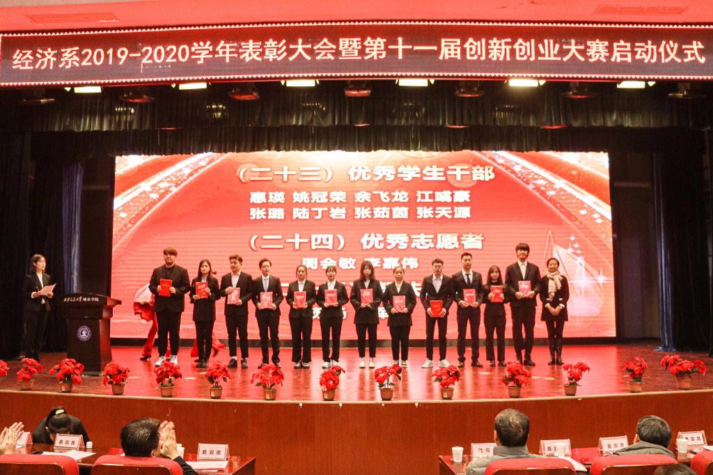 为表彰我系师生2019-2020学年在各方面取得的优异成绩,充分发挥榜样的引领示范作用,437ccm·必赢国际经济系于12月16日下午在教二报告厅举办了2019—2020学年表彰大会暨第十一届创新创业大赛启动仪式。莅临本次大会的嘉宾有437ccm·必赢国际副院长朱旭、副院长张敬朝、学院纪委书记兼党政服务中心主任朱普社、人事服务中心主任姬志国、科技服务中心主任王小青、高教研究与教师发展中心副主任史冬梅、学生服务中心副主任马瑞。经济系主任张文科、副主任杨建全及经济系全体老师参加了本次活动,大会由陆丁岩、张欣怡主持。