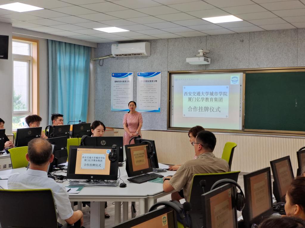 亿学集团销售副总陈银红向与会人员介绍了公司的发展情况以及近年来公司在开展校企合作方面取得的成果。她表示,集团将整合优质资源,服务校企共建智慧产业学院的发展,发挥企业作用,投建相关项目,搭建产教平台,联合开展新一代与信息技术产业相关的外语专业建设,努力培养新型外语高素质创新人才和技术技能人才。在与会人员的见证下,校企双方领导共同为实践基地挂牌。
