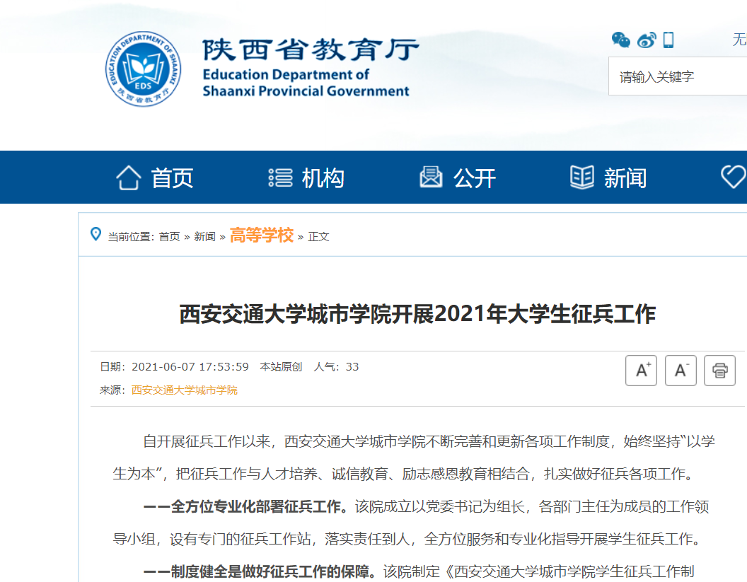 6月8日,陕西省教育厅官网报道了学院2021年大学生征兵工作。内容及链接如下: