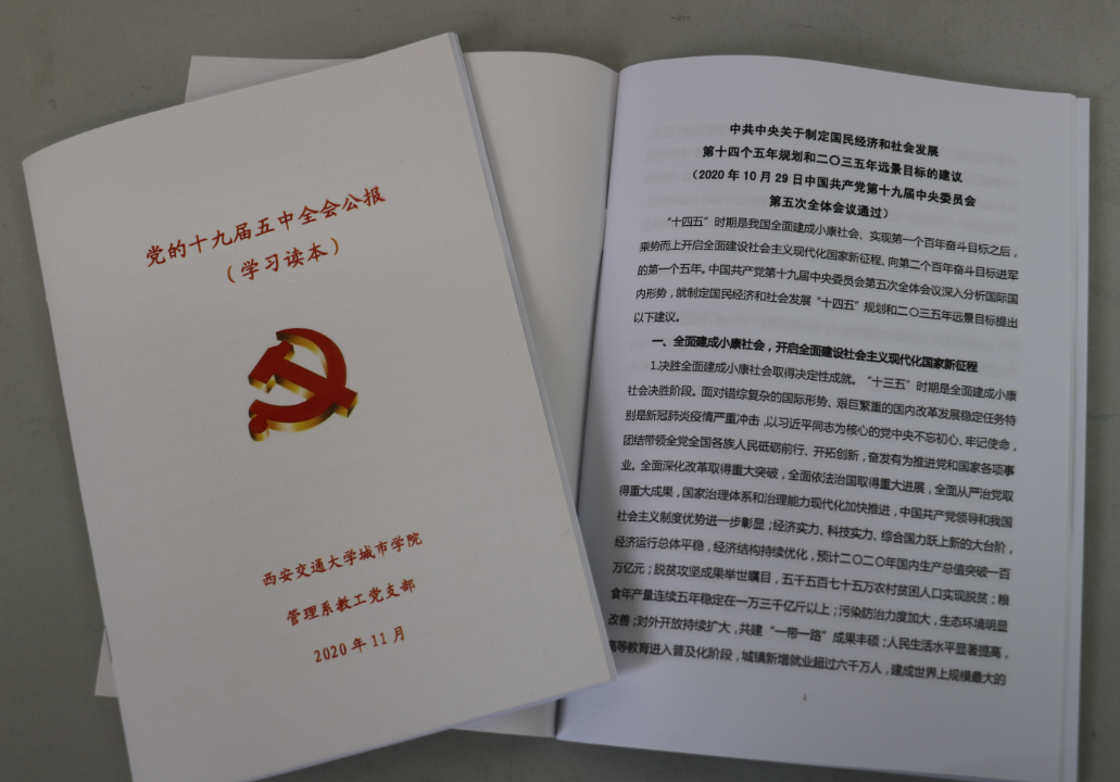 通过印制文件、配备党建学习记录本,联合统战成员,集中学习、代表讨论,将文件精神融入科学研究、教育教学中。2020年11月,管理系教工党支部印制《党的十九届五中全会公报(学习读本)》,发放给教职工,配备专门的党建学习记录本,组织“全会公报学习系列研讨会”,邀请学院党委委员冀祥副教授莅临指导,党员代表带领学习,教工党员结合课程思政、科学研究选题及研究内容展开深入地探讨,并落实在教学、科研课题申报、学术论文写作中。同时,建立“党员学习角”“党建知识学习专栏”,为教工党员日常学习交流提供学习材料与交流场地。