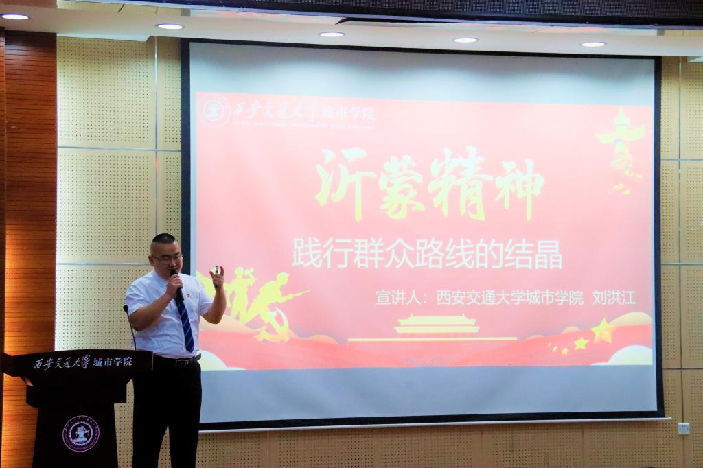 院学生会执行主席、中共党员、生在浙江嘉兴的陆一洲同学为大家宣讲了他心中的红船精神。他指出,开天辟地、敢为人先的首创精神,坚定理想、百折不挠的奋斗精神,立党为公、忠诚为民的奉献精神便是红船精神。土木191班班长关宁同学向我们讲述了我们共产党人刘启耀的一生,“腰缠万贯的讨米人”的故事诠释了共产党人对党的忠诚。他号召大家向刘启耀同志学习,做到“四个一”:一心一意,一以贯之,表里如一,知行合一,和“三个不”:不改齐心,不易其志,不毁其节。新时代沂蒙精神传承者刘洪江同学,用自己的故事向大家介绍了沂蒙精神,这是临沂人民支援革命战争的真实写照也是战火纷飞的革命时期孕育出来的伟大精神。随后,宣讲团的其他同学依次为大家讲述了西迁精神、“两弹一星”精神、北大荒精神、伟大抗疫精神等,它们共同形成了中国共产党人的精神谱系,并在中华民族的精神脊梁中注入了新的元素。