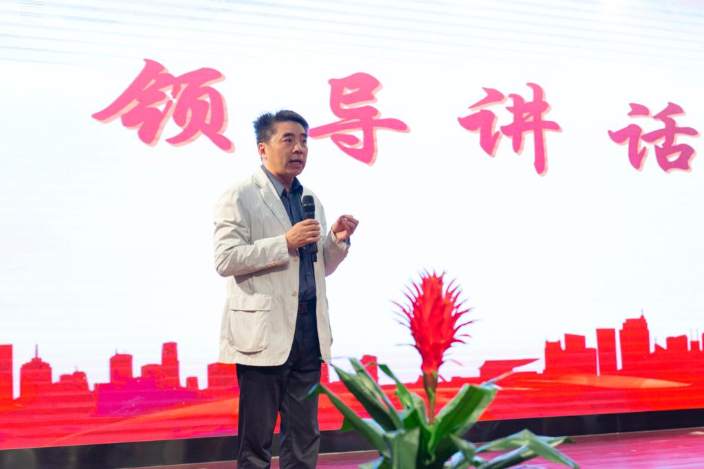 最后,学院副校长朱旭教授上台发表。他指出,本次活动的举办源于师生们齐心协力,共同协作,更离不开大家对党、对国家发自内心的热爱。他对同学们提出了三点期望:一要以史明志,要不断增强爱党、爱国的情怀。二要坚定四个自信,饮水思源,珍惜当下。三要将红色基因践行在日常学习上,要发扬刻苦奋斗、互帮互助的精神,发扬我党的优良传统,做为祖国为社会有贡献的人。