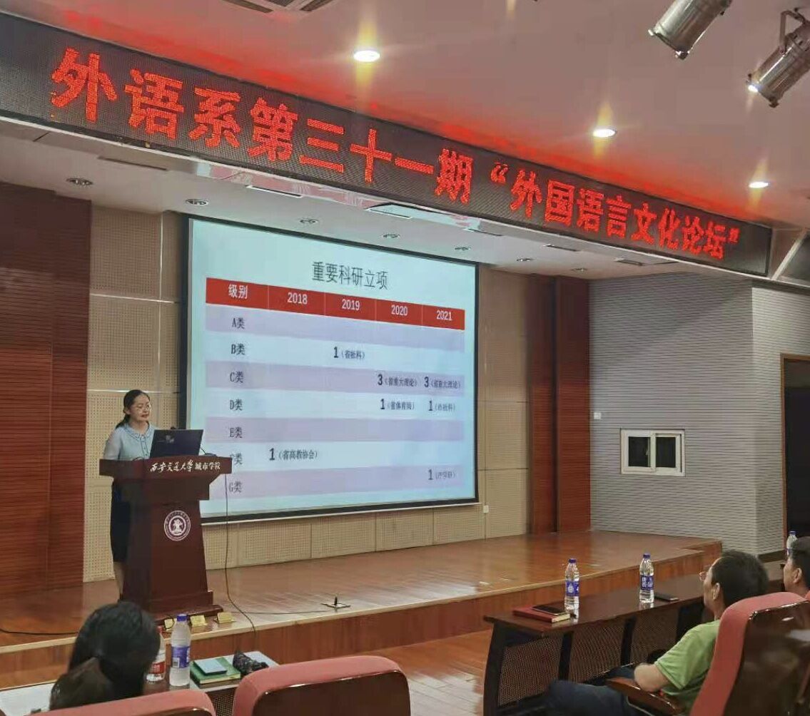为营造我院外语语言及文化研究氛围,拓展我院师生的语言学习视野,6月22日下午,西安交大437ccm·必赢国际外语系在学院F100报告厅举办了第31期“外国语言文化论坛”讲座。学院副院长朱旭教授莅临指导。外语系副主任徐素云副教授主持并介绍了近年来我系在科学研究、人才培养尤其是在重要科研立项、项目申报质量,以及高级职称晋升等方面所取得的突破。