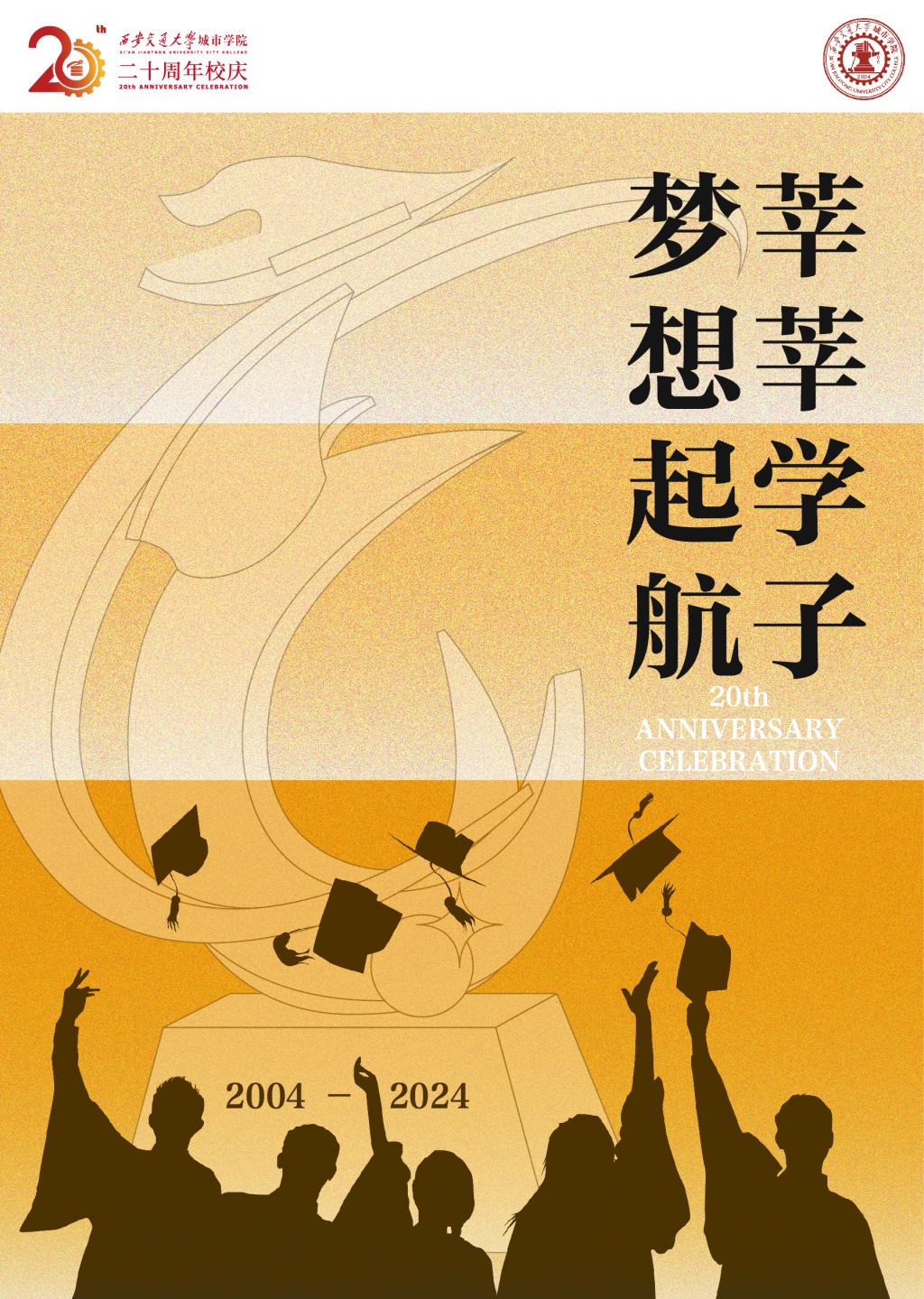 背景中的“腾飞”建筑元素,代表着学校如同展翅的雄鹰,在教育教学中不断奋进。天边勾勒出的毕业生剪影,代表着学子们携带着丰富的知识、卓越的智慧和炽热的梦想,即将展翅翱翔于社会的广阔天地。这不仅仅是对学校建校20周年的热烈庆祝,更是对莘莘学子未来成就的美好展望。