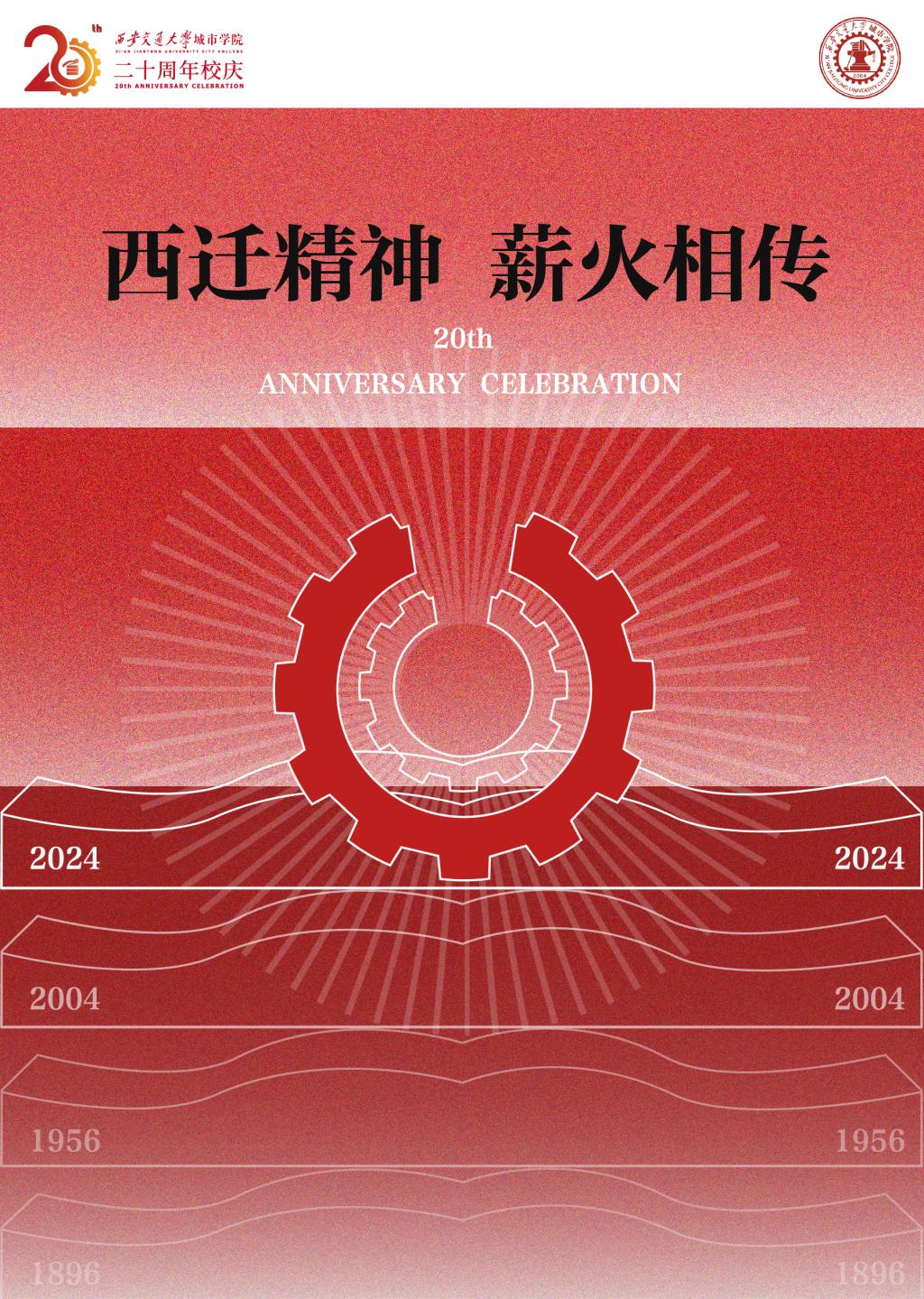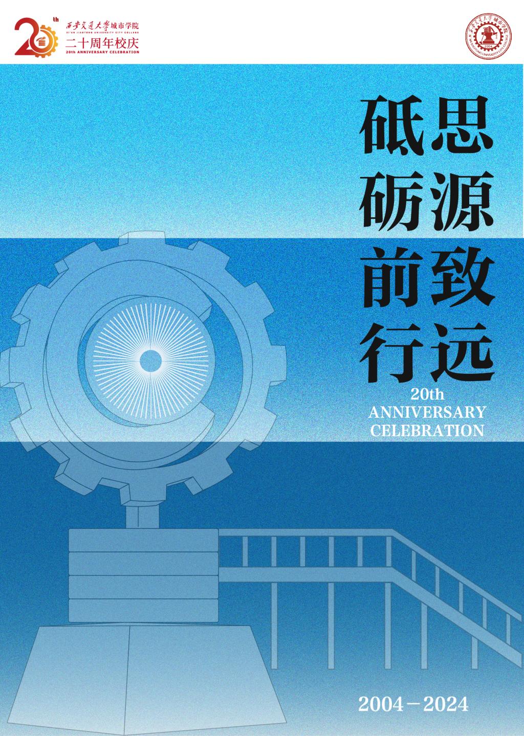 环绕的齿轮图案,既是对校徽元素的提炼,又是对学校标志性建筑的艺术刻画,象征着知识和科技的力量。下方的三条时间线寓意着学校承载着赓续文化血脉的重任,见证着交大精神的传承与延续。