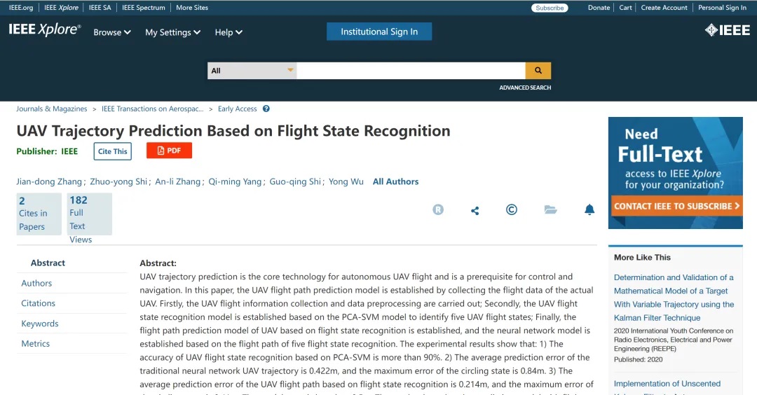 当第六次投稿被拒绝后,石卓勇认真整理了思绪和投稿目的,用两周时间将论文中的语言、术语修改了两遍,在经历了漫长的投稿、修改、审核和等待后,他以第一学生作者和通信作者在《IEEE Transactions on Aerospace and Electronic Systems》(SCI航空一区TOP期刊)上发表了题为《UAV Trajectory Prediction Based on Flight State Recognition(基于飞行状态识别的无人机航迹预测)》的论文。