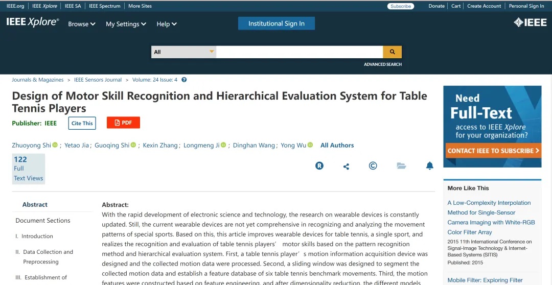 石卓勇还将喜爱打乒乓球的兴趣与科研相结合,自己动手开展实验。经过一年多的打磨,他以第一作者在《IEEE Sensors Journal》上发表了题为《Design of motor skill recognition and hierarchical evaluation system for table tennis players(乒乓球运动员运动技能识别和分层评价系统的设计)》的论文。以这篇论文为基础,石卓勇申请了西北工业大学研究生实践创新能力培育基金,目前,他负责的“乒乓球动作技能识别与分层评估体系设计”项目已获批立项。
