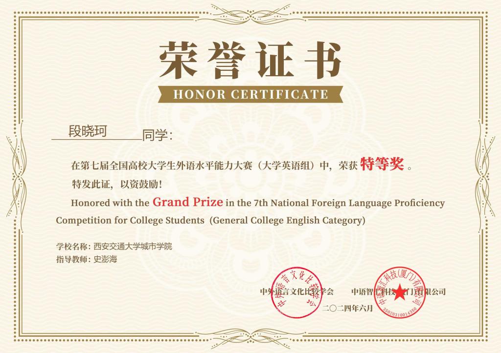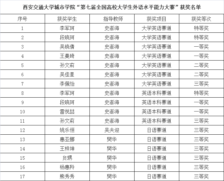 近日,第七届全国高校大学生外语水平能力大赛落下帷幕,我校外国语学院学生喜获佳绩,参加英语本科组及大学英语赛道的三名学生获特等奖,另有多名学生获一、二、三等奖;外国语学院教师史澎海、吴夫迎、樊华获“优秀指导老师奖”,437ccm·必赢国际荣获“最佳院校组织奖”。