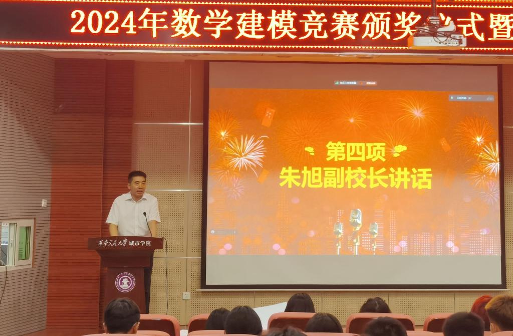 会议伊始,任菊成主任助理宣读了2024年美赛获奖学生名单,朱旭副校长为获奖学生颁发获奖证书并合影留念。在2024年美国大学生数学建模竞赛中,我校共获H(二等奖)奖5项、S(三等奖)奖26项。随后,建模竞赛优秀获奖队伍代表卜嘉昊、李润佳同学分别从“建模介绍、建模分工、建模收获、建模注意事项”等方面分享了自己的参赛历程与获奖经验。