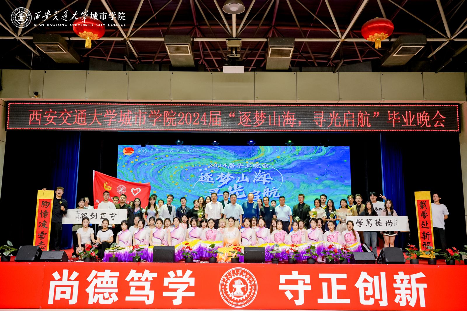 为欢送2024届毕业生,用歌舞表达对毕业生的美好祝福和期望,将四年最美的青春记忆定格在城院校园里,学校于6月24日晚在大学生活动中心举办“逐梦山海,寻光启航”2024届毕业晚会。校长陈光德,党委书记张爱萍,副校长朱旭,副校长岳华海及各二级学院(教学部)、处(室)负责人和2024届毕业生、城院学子代表们参加本场晚会。传媒学院教师高宇、护理与康复学院辅导员路凡、2024届毕业生罗兰、崔雨婷担任主持人。
