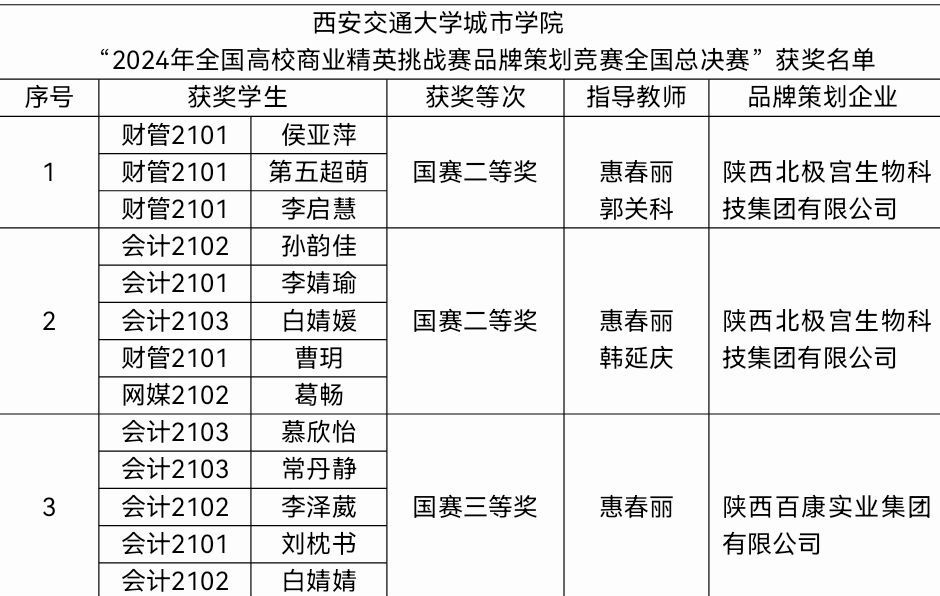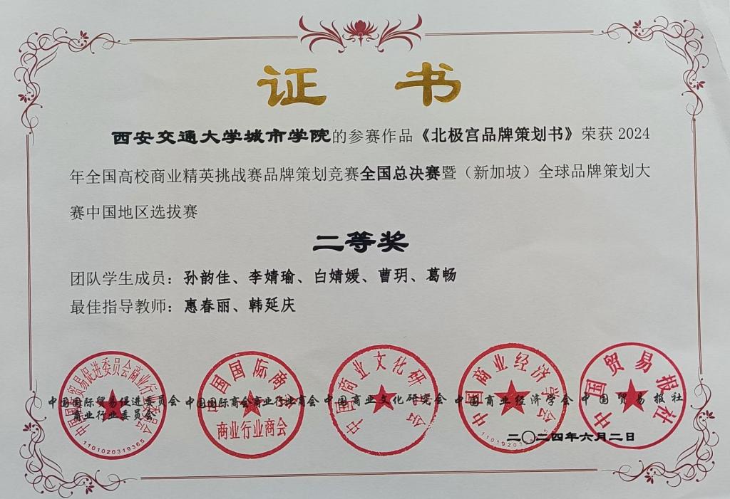 2023年12月竞赛启动以来,管理学院充分动员,精心组织,历经知识赛、校赛、全国总决赛预选赛等环节,三支队伍获得全国总决赛资格。参赛团队选择真实存在的产品或服务品牌为策划对象,从品牌现状、品牌元素和定位、品牌核心价值、品牌推广和传播、品牌资产保护等方面撰写品牌策划书,总决赛采取提交品牌策划书、品牌策划方案陈述和实时答辩的方式进行,经过紧张的陈述和答辩,我校参赛的三支队伍获得全国二等奖二项,全国三等奖一项,产学合作企业陕西北极宫生物科技集团有限公司和陕西百康实业集团有限公司分别获得产教融合项目优秀企业奖。