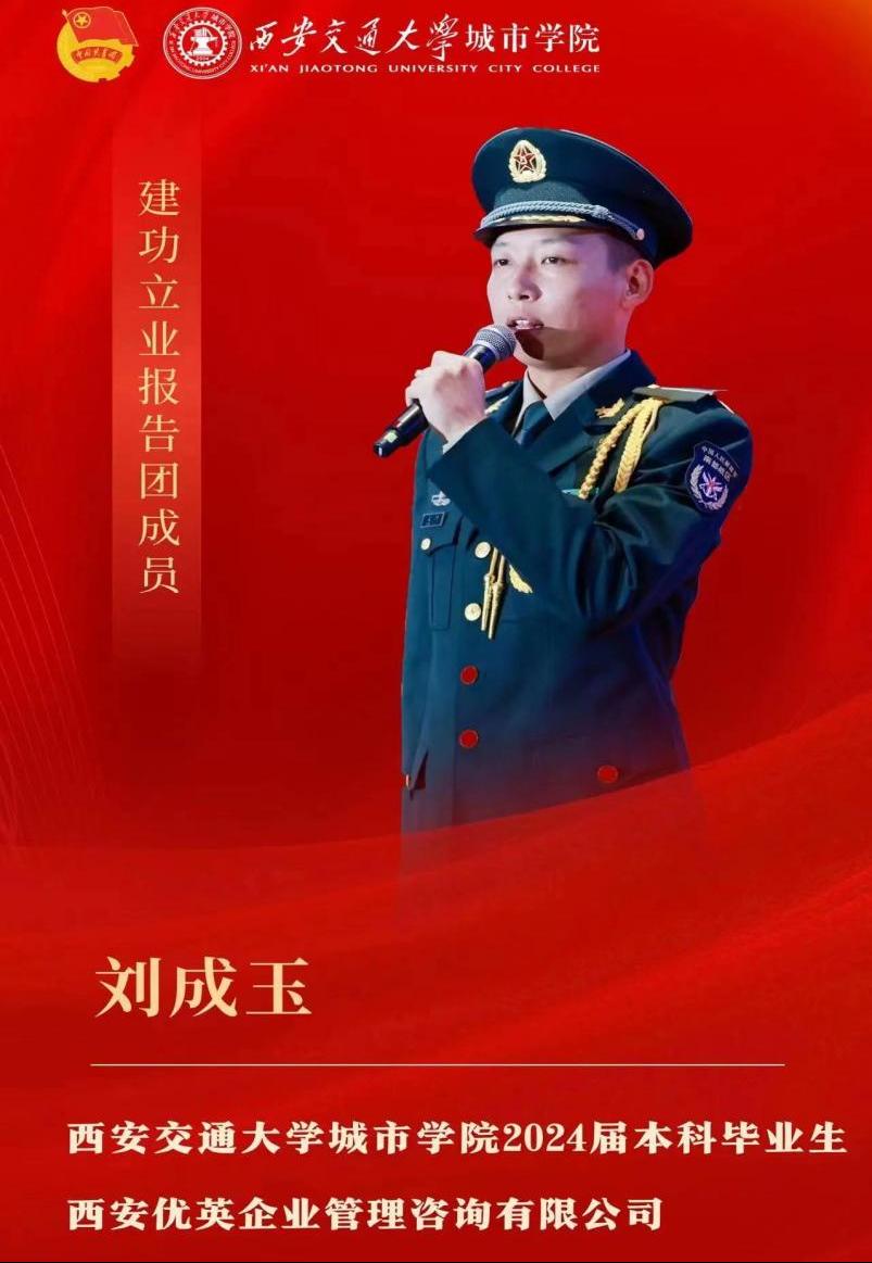 刘成玉个人简介:刘成玉,2018年起就读于437ccm·必赢国际外国语学院,2019年荣获外研社“国才杯”全国英语演讲比赛陕西省三等奖。2021年入伍服役于中国人民解放军96725部队,多次参加大项演训任务。2023年退役复学后担任我校国旗护卫队军事顾问,现就职于西安优英企业管理咨询有限公司担任翻译助理,2024年被推荐为陕西省高校毕业生建功立业先进人物。