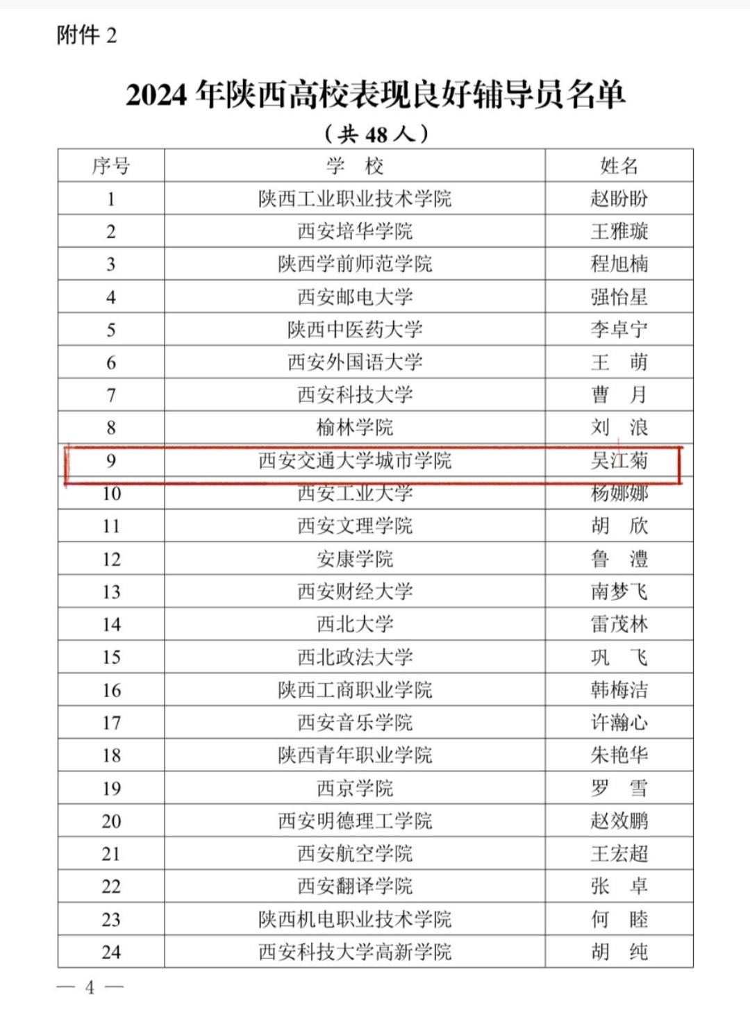 近日,陕西省委教育工委开展了2024年陕西高校辅导员先进典型推选展示工作,经个人申请、学校评审、通讯评审、现场答辩、实地考察、问题排查、电话随访学生等环节,我校辅导员吴江菊在2024年陕西高校辅导员先进典型推选展示活动中受表扬。