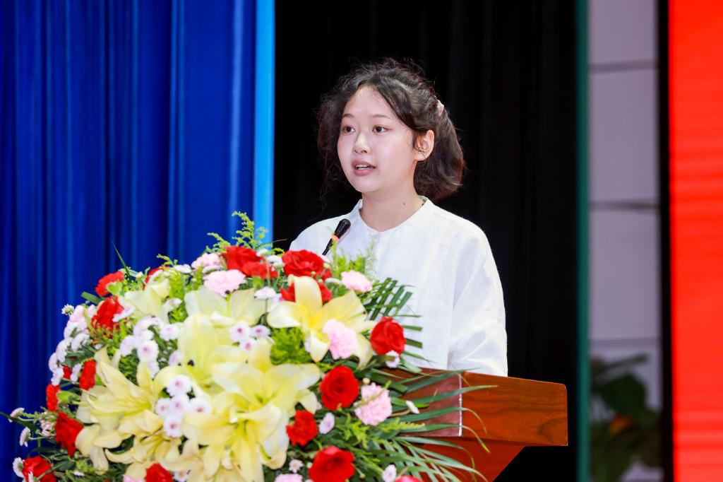 新生代表、管理学院会计2403班田果同学代表全体新生发言。初入大学校园,她期待与同学们一起充实而有意义地度过大学生活。她表示,一要尽快适应新的环境,养成好的习惯;二要培养独立思考和学习的能力,绽放出属于自己的精彩;三要明确自己的人生目标,制定科学合理的学业和就业规划,用智慧和汗水书写属于自己的辉煌篇章。